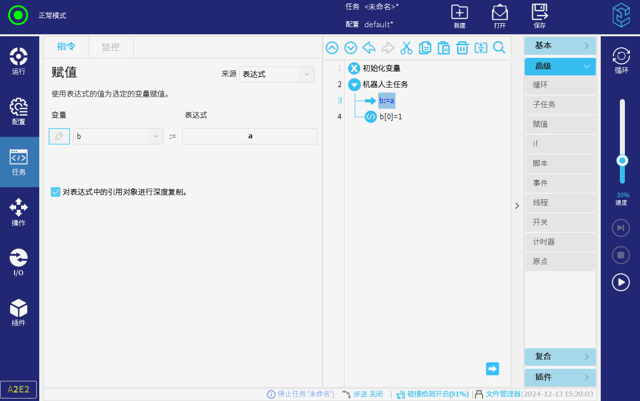 任務中添加下圖程序程序,將數組a賦值給數組b,再修改b數組的值,不勾選深度賦值