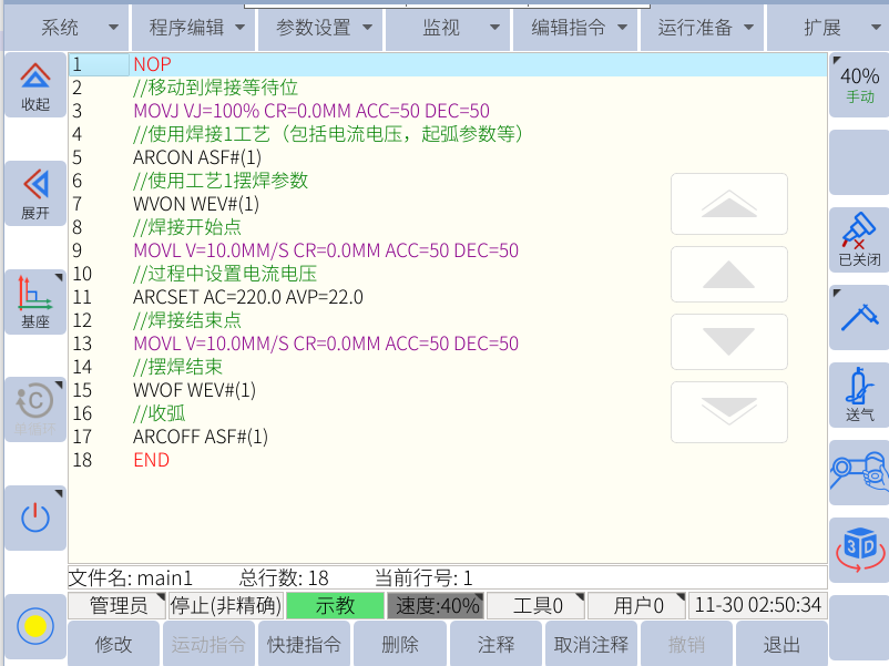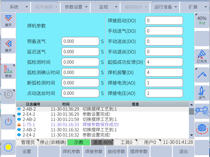 直到這個時候,焊接配置已經完成,這個時候可以點擊左側圖標觀察能否手動出絲,送氣。