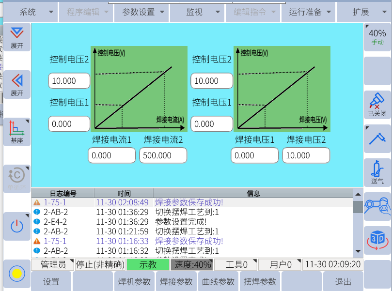 注:曲線參數設置會直接影響焊接參數里的電流電壓范圍,即焊接電流范圍:焊接電流1~焊接電流2