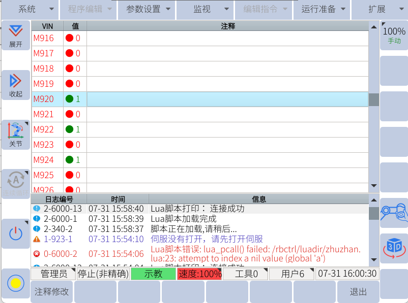 示教器中查看對(duì)應(yīng)的M920、M922、M924分別狀態(tài)為1