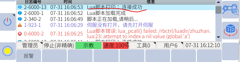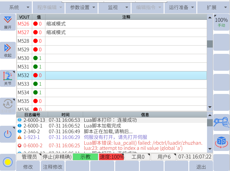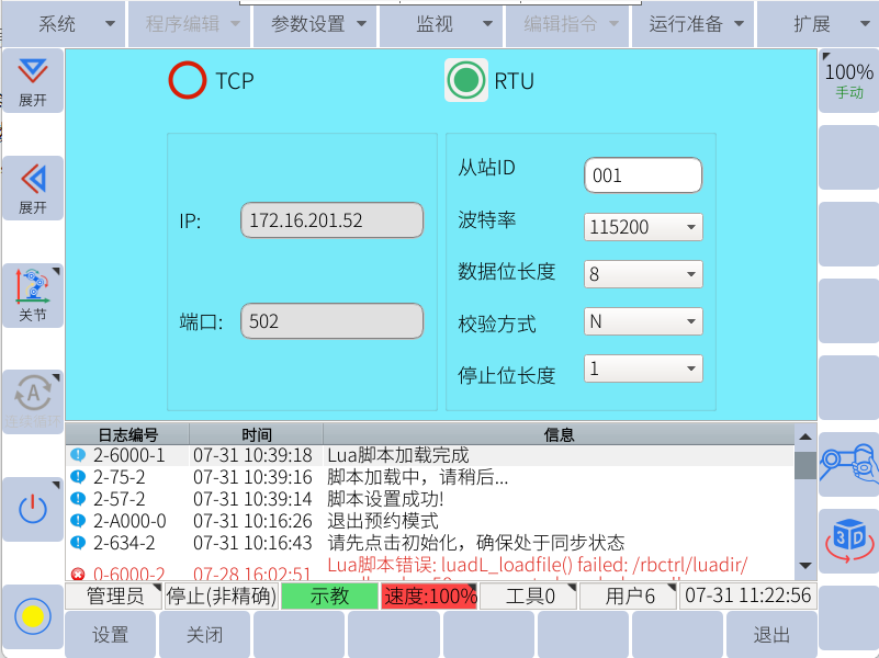 將機(jī)器人端485線接好,目前設(shè)置波特率為115200,將機(jī)器人腳本配置好,如下圖所示