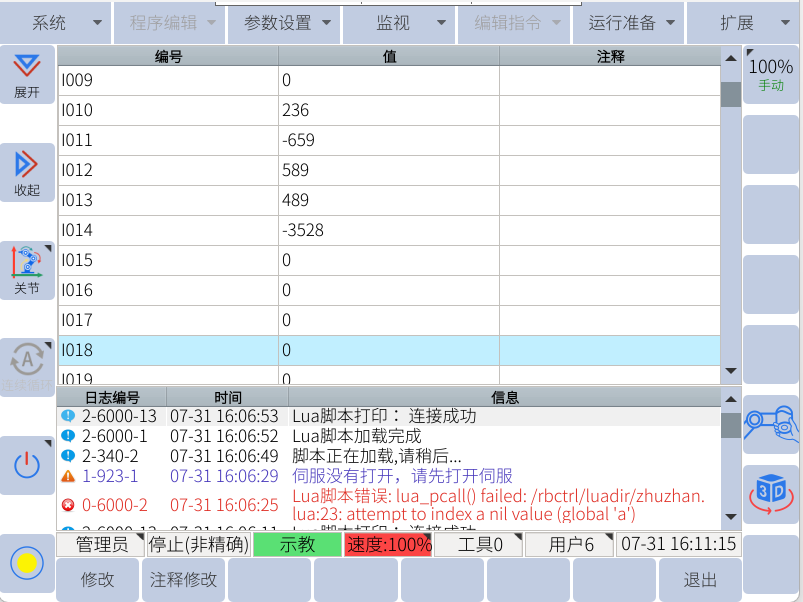 通過(guò)助手向寄存器300-304賦值,可通過(guò)示教器查看I0-I4數(shù)值,確實(shí)數(shù)值是否正確,如下圖所示