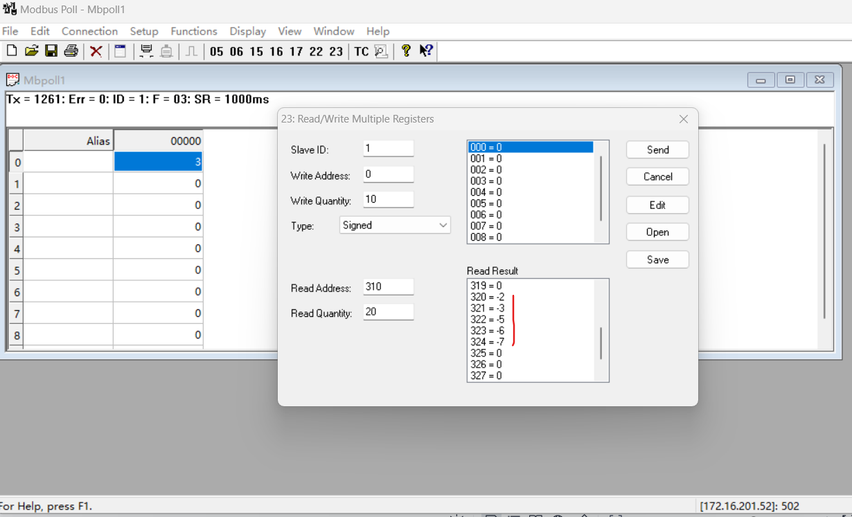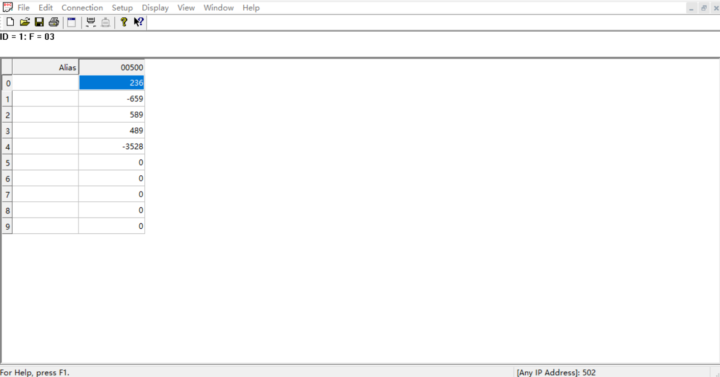 助手端將400寄存器設(shè)置為123,401寄存器設(shè)置為23,402寄存器設(shè)置為-345,403寄存器設(shè)置為-876,404寄存器設(shè)置為2345