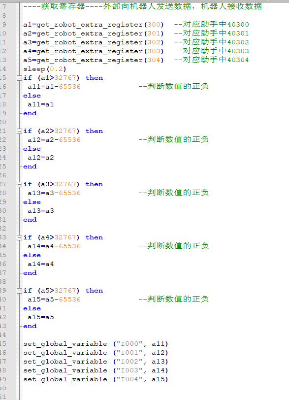 6.機(jī)器人通過(guò)全局變量I10-I14,將數(shù)據(jù)寫入寄存器320-324,腳本如下所示