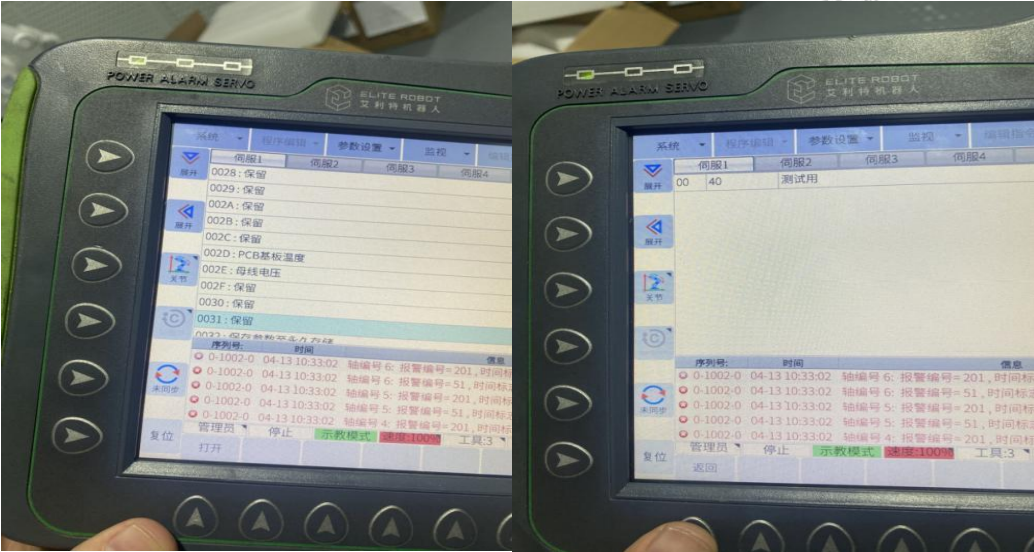 在參數設置》伺服參數》0031:保留》40,中,將報警的關節伺服參數 0031,從設定值 40 改為 38,關節重啟設備。該參數表示報警電壓的閾值