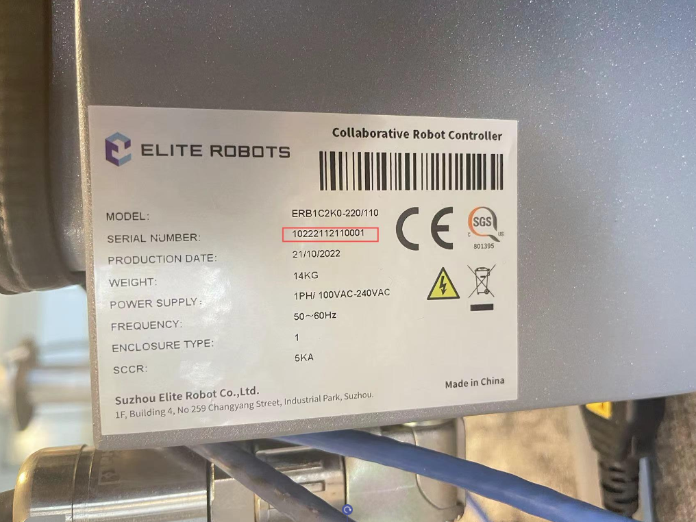 步驟1:首先確定機械臂本體的序列號和控制柜的序列號是否匹配,機械臂本體的序列號在1關節標簽處,控制柜序列號在控制柜右側標簽處。如下圖: