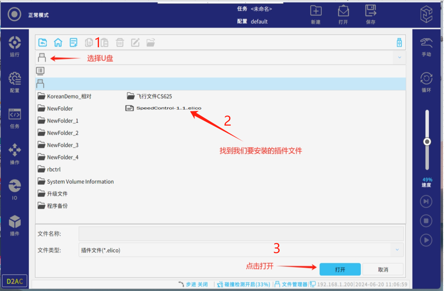 CS機器人在與外部設備進行通訊時,通常會使用機器人內部的寄存器進行信息交互,機器人自帶可查看modbus寄存器,關于布爾寄存器、整數寄存器、浮點數寄存器的查看可安裝寄存器監控器插件進行查看,插件文件詢問艾利特人員方可獲得,存放至U盤內,并插入機器人示教器或控制柜USB接口。
