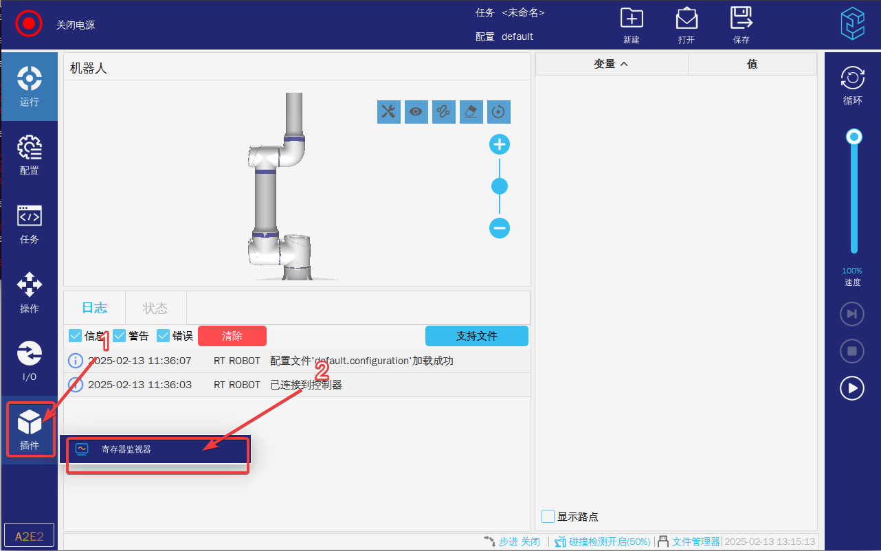 1. 點擊示教器屏幕左側底部插件按鈕,再點擊寄存器監視器進入插件界面;