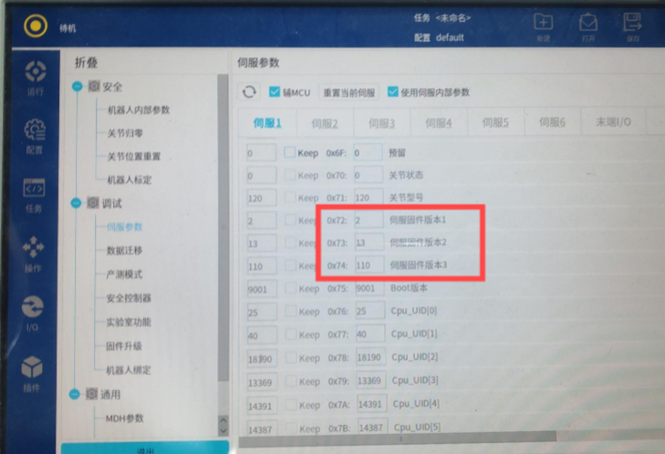 (4)下拉至”72,73,74列”,如伺服版本皆為“0”,則伺服固件異常。下圖為輔MCU正常時的版本數據。
