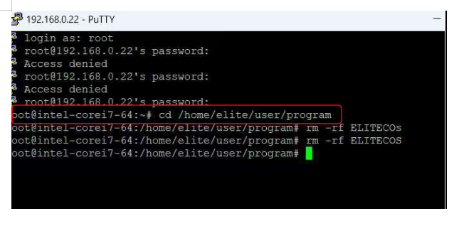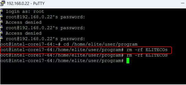 2.1通過本地PC連接到控制器,使用ssh登錄的方式登錄到控制器內部,刪除ELITECOs文件。該方法支持任意控制軟件版本下。