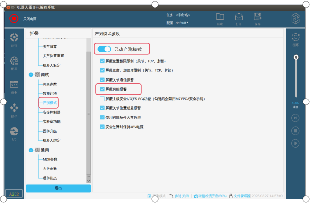 第二步:在專家模式下,選擇產測模式,啟用產測模式,勾選屏蔽伺服報警。如圖-2紅框標記所示。