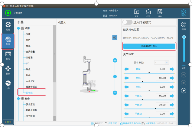 第三步:退出專家模式,這個時候因為伺服報警已經屏蔽了,所以機器人可以正常上電了。如圖-3所示在配置界面→選擇打包位→點擊移至默認打包位就可以進入圖-4界面。