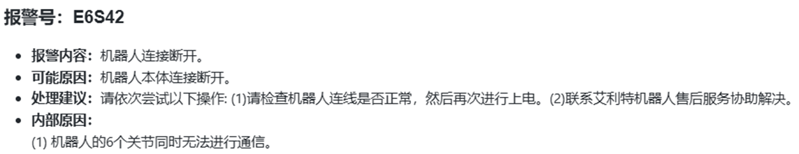 E6S42 報警所指示的是:機(jī)器人連接斷開。其具體釋義如下: