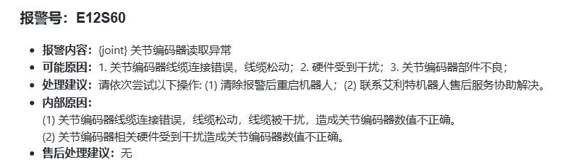 2. 數字釋義:“12” 指代伺服報警;“60” 明確為 {joint} 關節(jié)編碼器讀取異常。