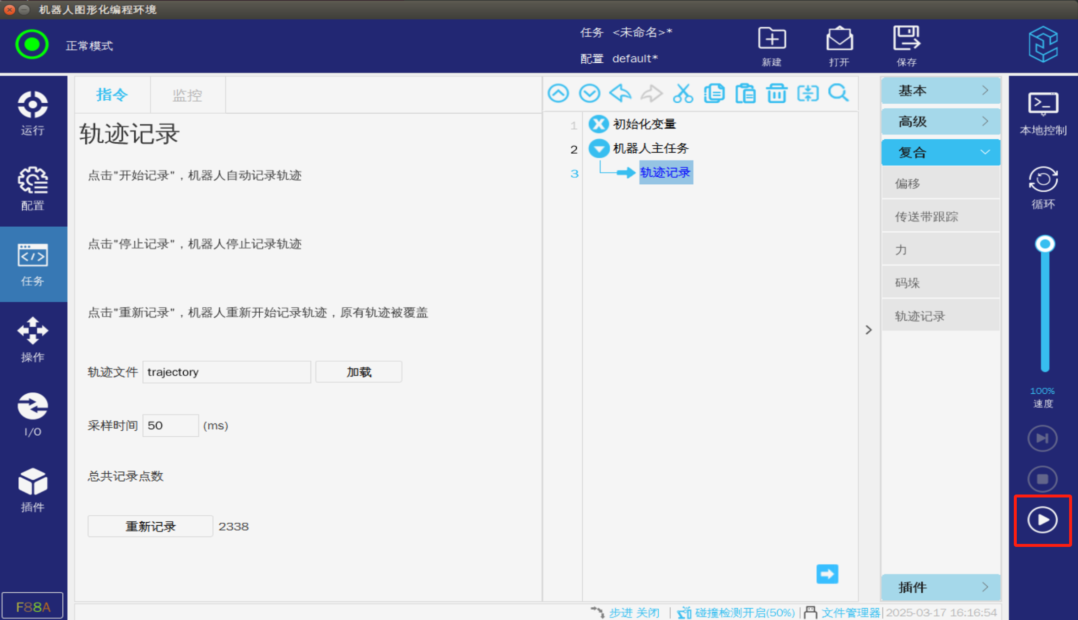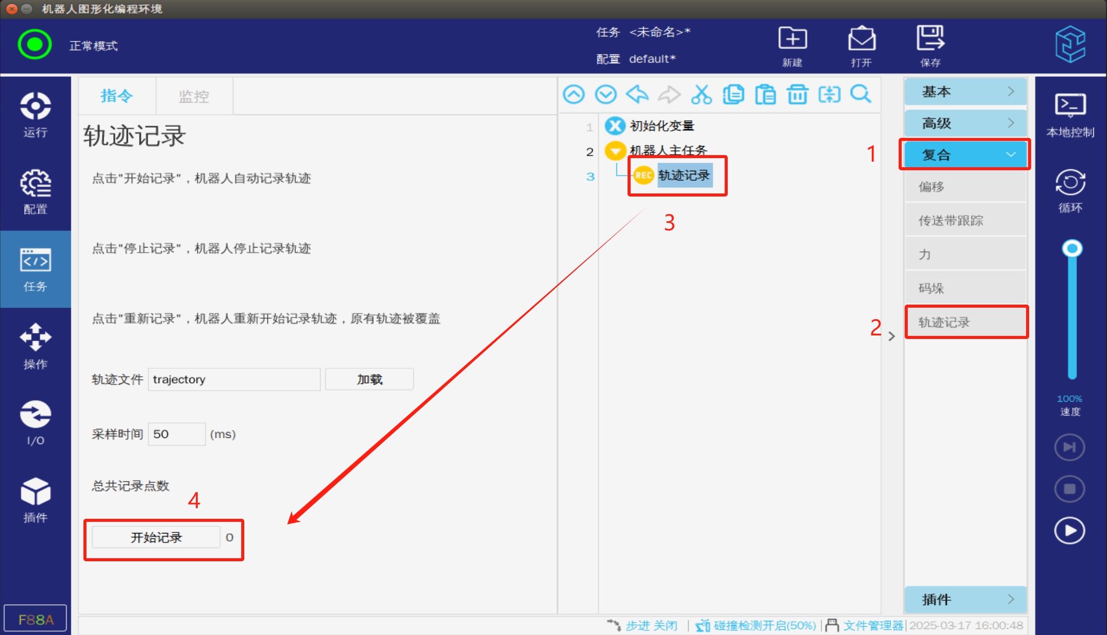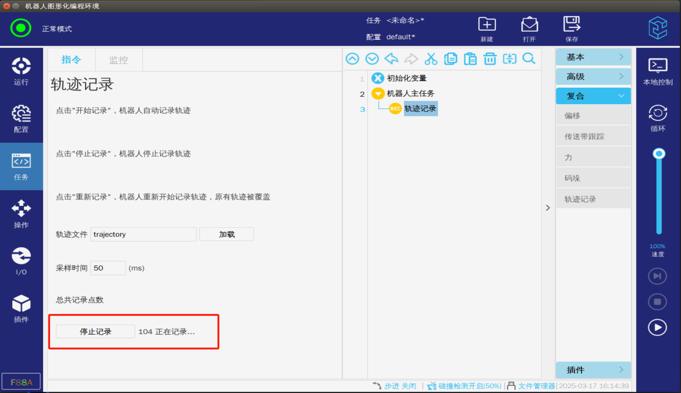 1、點擊導(dǎo)航欄任務(wù),右側(cè)點擊復(fù)合下拉選中軌跡記錄,點擊左下角開始記錄,然后按下示教器背部拖動按鈕拖動機器人;