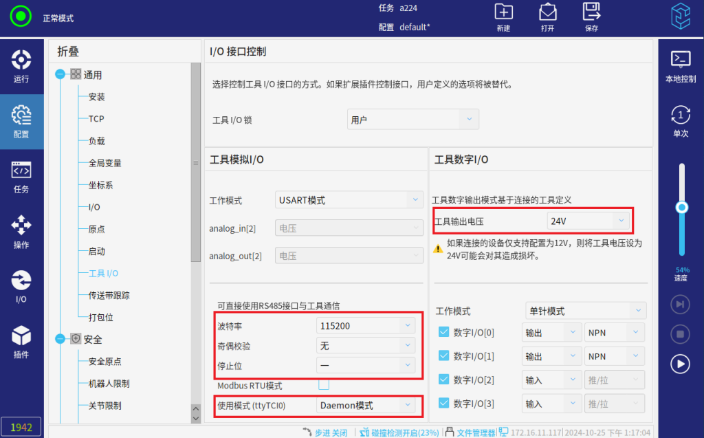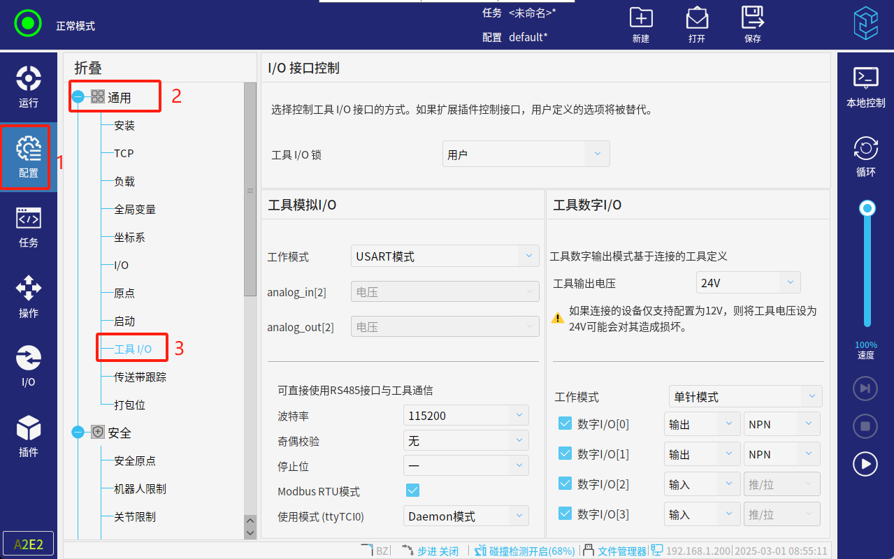將工具I/O的配置按下圖配置好,若是CSF系列機器人則配置和下圖完全相同;如果是CS標準機系列則波特率按實際填寫。