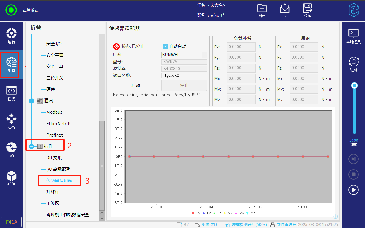 如果配置正確,點擊啟動后負載補償、原始和數據圖上會顯示當前的力矩數據。如果沒有數據顯示;則上述配置流程有選項配置錯誤,連接失敗。