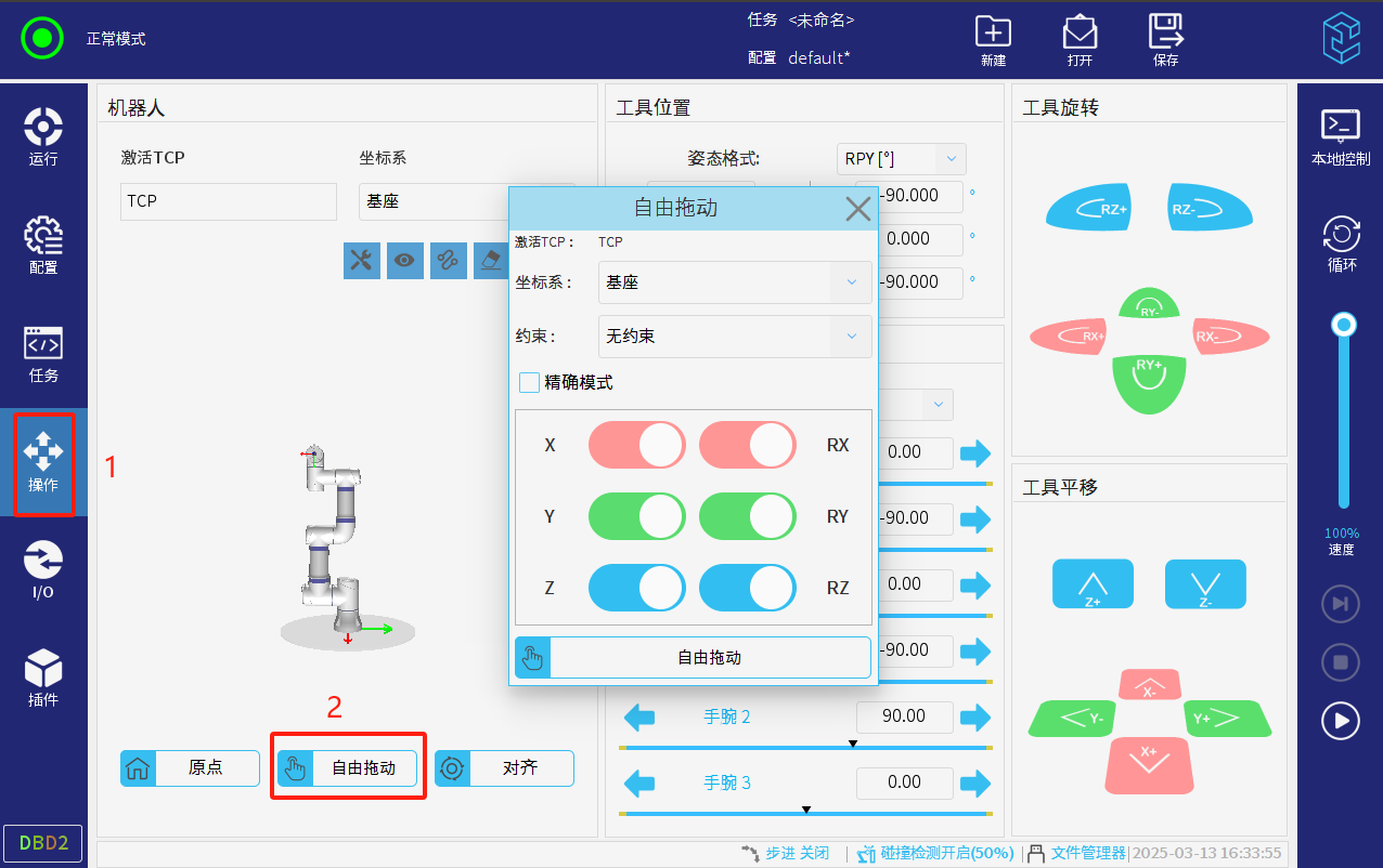 勾選后即可手動拖動機器人,機器人會根據力傳感器的反饋值來進行拖拽運動。