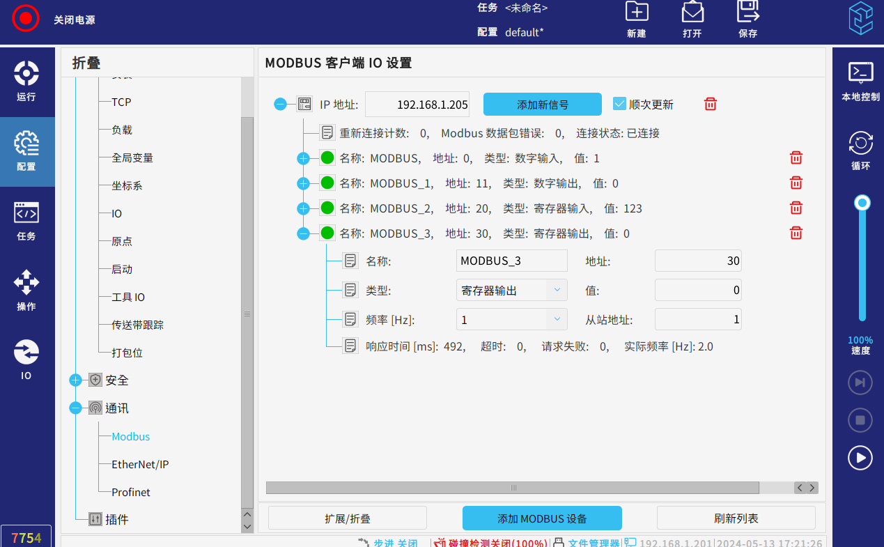 點擊機器人示教器配置--通訊--modbus--添加modbus設備,輸入ip(此處ip為主站ip)