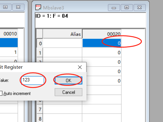 輸入id 1,功能碼04,地址20,數量5(自定義),點擊ok