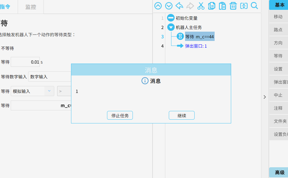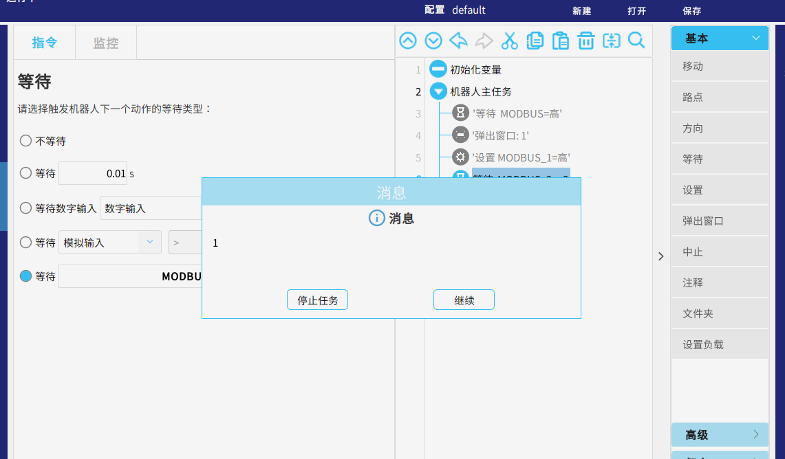 運行任務,當從站的信號modbus=高 時 ,頁面彈出窗口提示“1”,代表已獲取到該mosbus