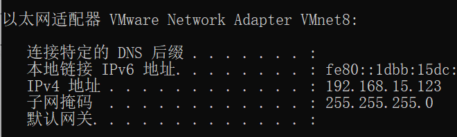 2. 本機操作:cmd 窗口輸入 ipconfig ,找到虛擬機軟件的 IP:192.168.15.123 。