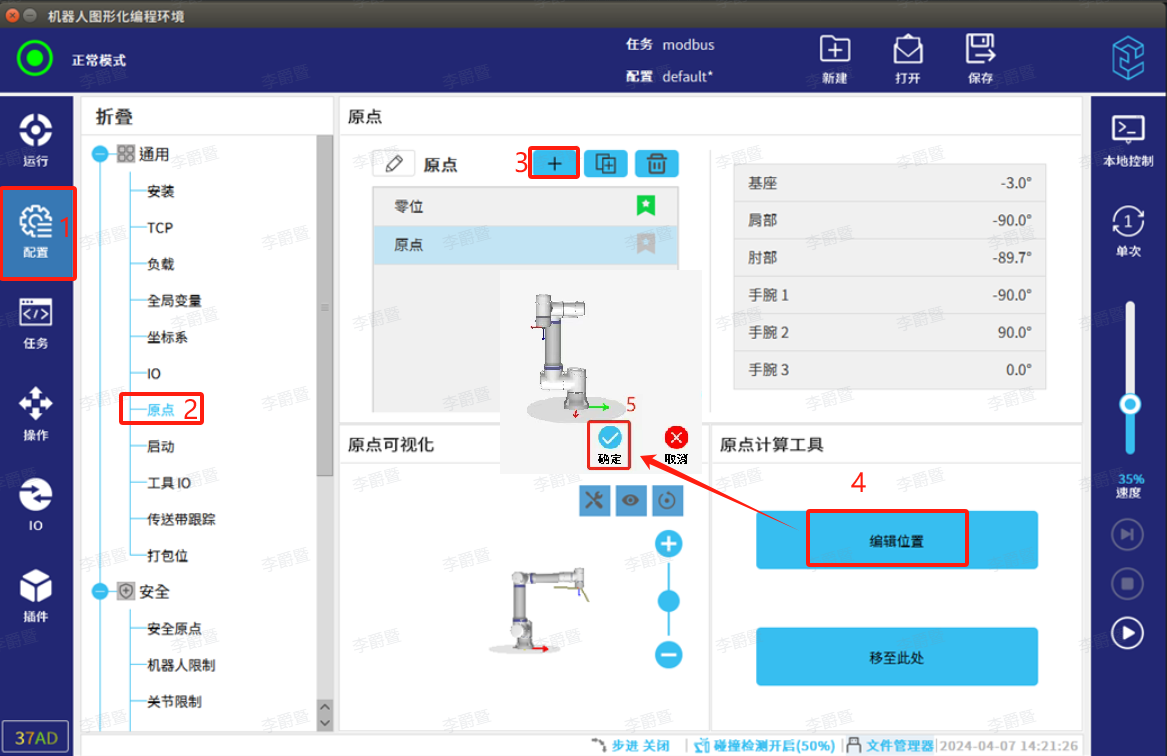 2 添加一個原點位置:配置—原點—編輯位置—移動到原點位點確認,如圖2.1.2所示:(這里的原點是指機器人在項目中的一個安全位,可根據現場實際情況修改)
