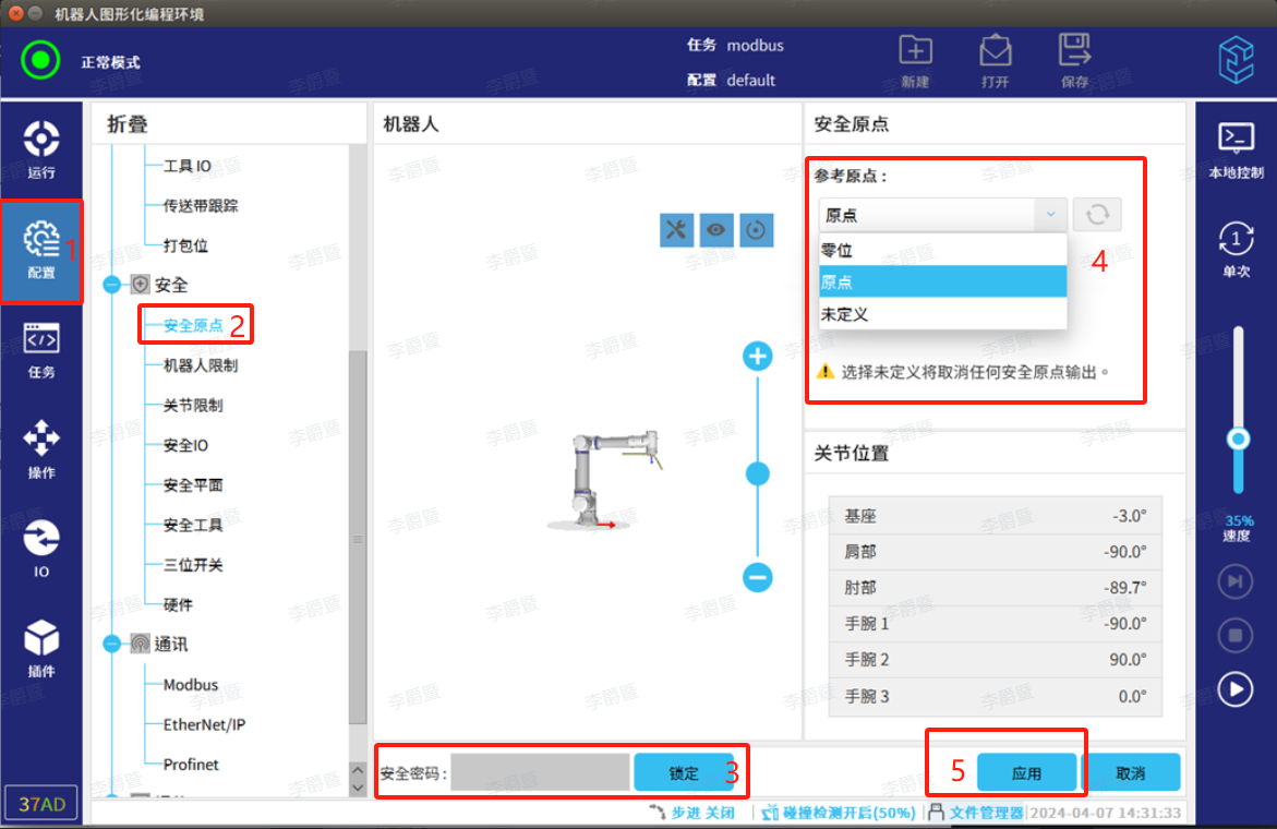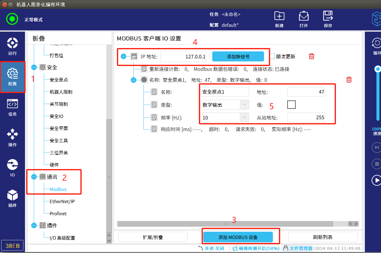 3. 配置modbus信號為安全原點信號輸出,要求:應用版本要求2.11及以上,IO/高級配置插件版IOExtensionConfig-1.2.11.1及以上(modbus通訊機器人作為主站時建議使用)