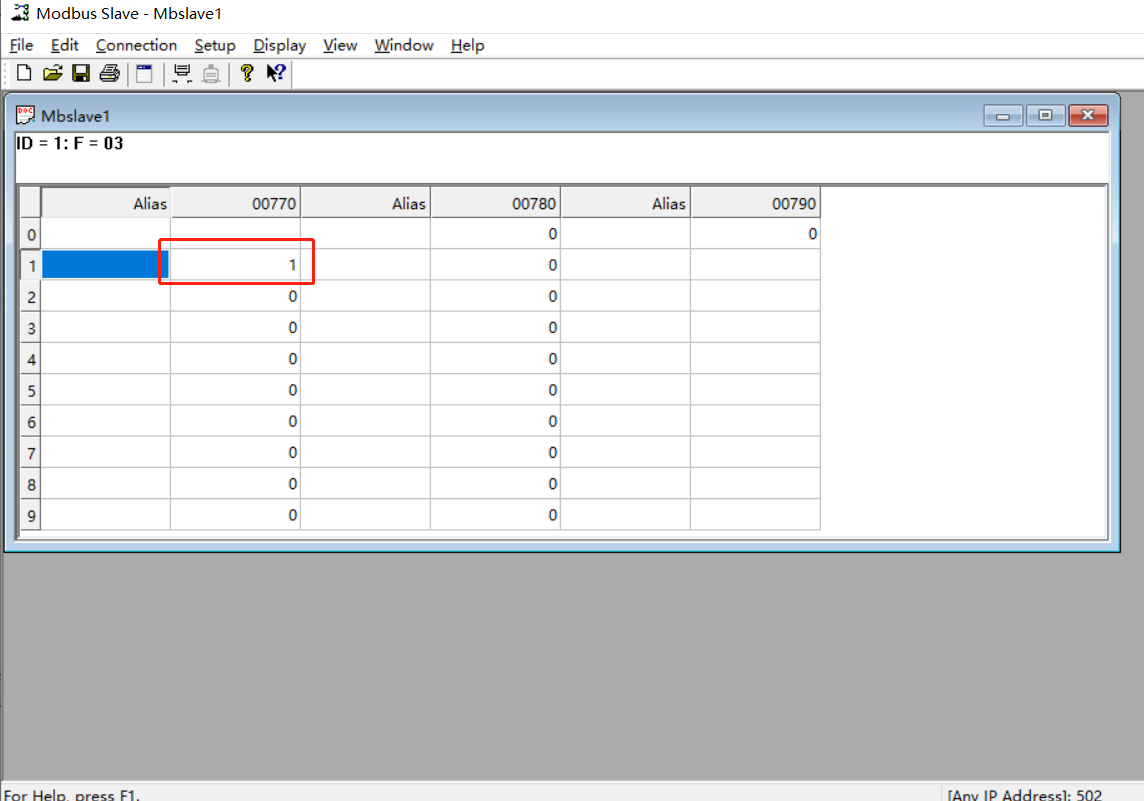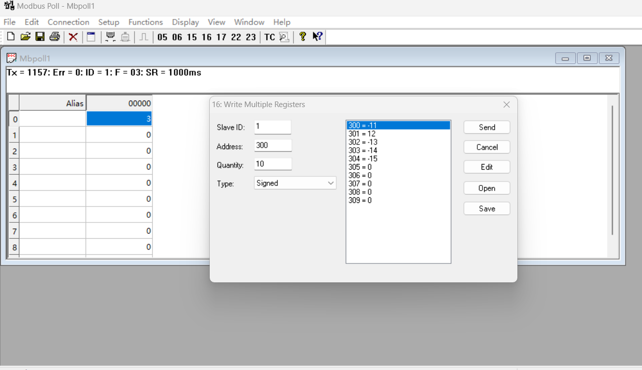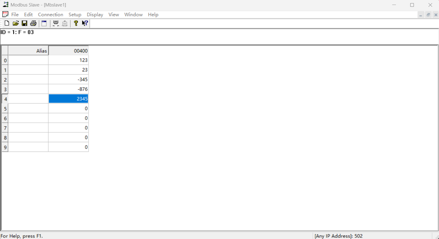 助手端將400寄存器設(shè)置為123,401寄存器設(shè)置為23,402寄存器設(shè)置為-345,403寄存器設(shè)置為-876,404寄存器設(shè)置為2345