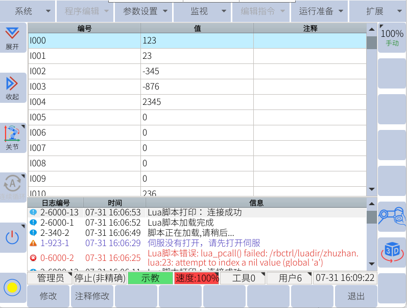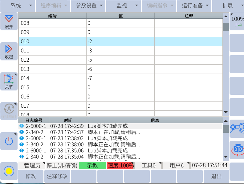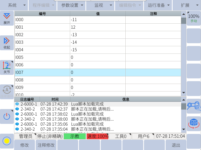 通過助手向寄存器300-304賦值,可通過示教器查看I0-I4數(shù)值,確實(shí)數(shù)值是否正確,如下圖所示
