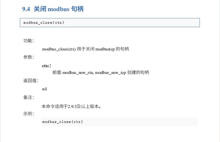 ModBus Master接口常用獲取modbus、連接modbus、關(guān)閉modbus、設(shè)置slave、讀取單個(gè)線圈、寫入單個(gè)/多個(gè)線圈、讀取單個(gè)寄存器、寫入單個(gè)寄存器等指令,本文主要講解以上指令,具體指令詳解如下圖所示,其他指令也可參考EC-lua手冊ModBus Master章節(jié)