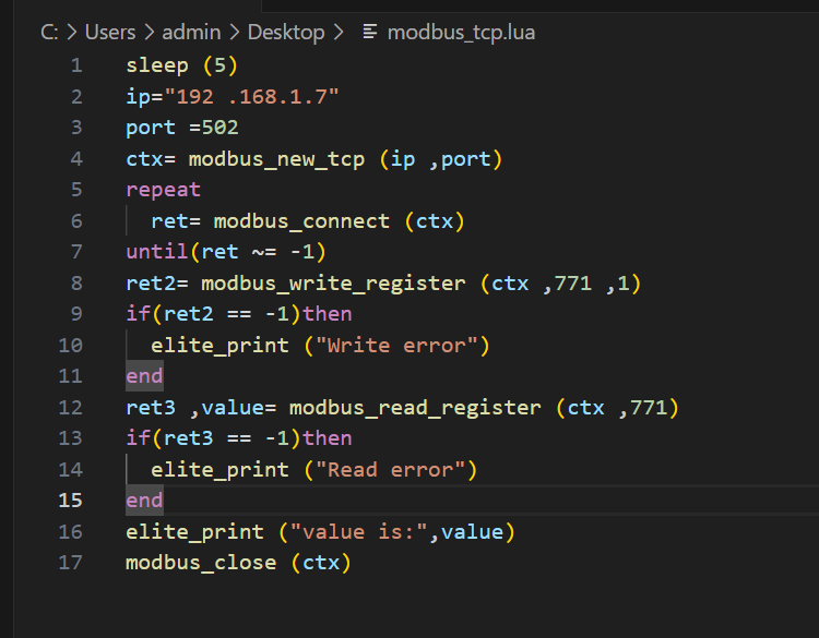 ModBus主站功能通過lua腳本實(shí)現(xiàn),可以參考EC-lua手冊進(jìn)行使用。其中MODBUS MASTER為已經(jīng)封裝的接口,用戶只需傳入相應(yīng)參數(shù)即可;如有其他特殊協(xié)議要求,可以使用TCP/UDP通訊、485通訊、TCI通訊(工具末端485)和232通訊等。