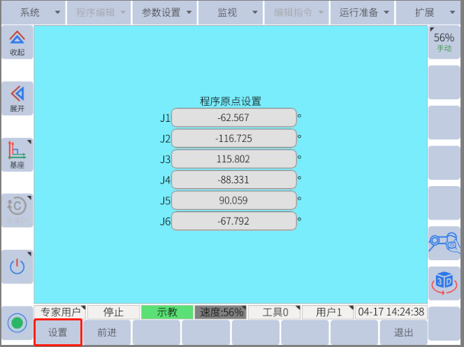 2. 將機(jī)器人移動(dòng)到所需的程序起始位置。導(dǎo)航到運(yùn)行準(zhǔn)備 -> 零點(diǎn)設(shè)置 -> 程序原點(diǎn),按“設(shè)置”按鈕,將機(jī)器人當(dāng)前位置設(shè)置為程序原點(diǎn)