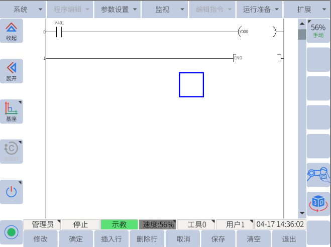 機(jī)器人進(jìn)入管理員權(quán)限(密碼:333333),導(dǎo)航到擴(kuò)展 -> 用戶(hù)PLC,使用梯形圖關(guān)聯(lián)M401和需要輸出的數(shù)字IO
