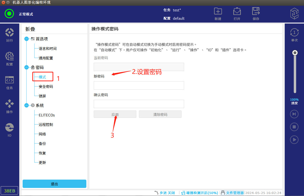 在手自動模式切換中,從自動模式切換成手動模式需要輸入之前設置好的密碼,所以密碼一定要記住,如果忘記了可以聯系ELITE機器人售后進行清除重新設置