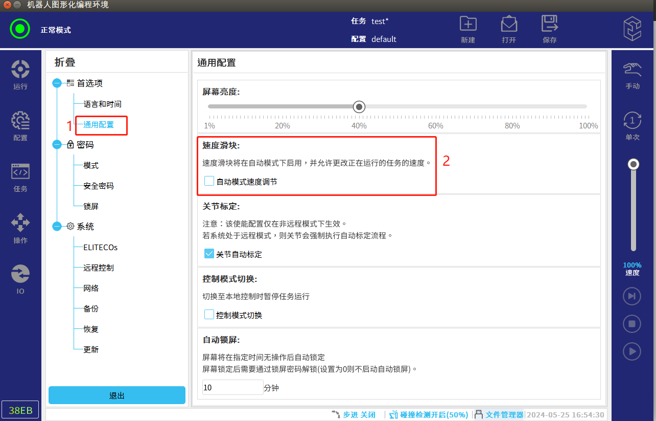 如果需要在自動模式下修改速度,則需要在設置模式的界面中選擇通用配置,勾選自動模式速度調節,此時再切換成自動模式時,右邊的速度滑塊就可以進行速度調節
