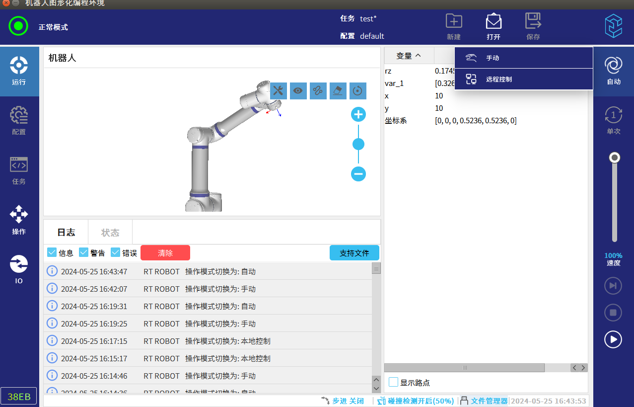 手動模式即機器人需要用示教器來控制機器人的移動,一般用于調試階段,進行點位示教以及流程驗證