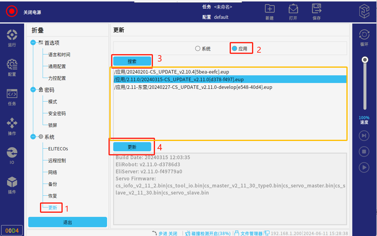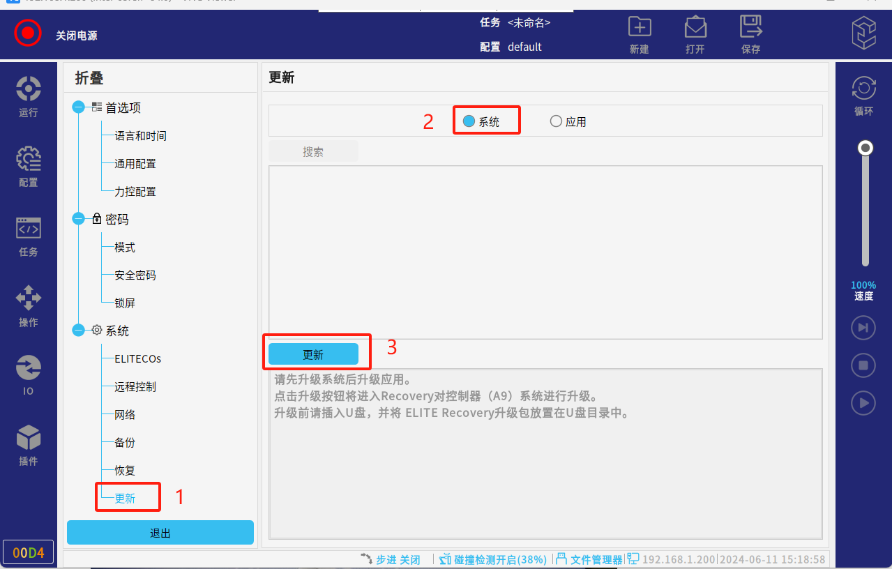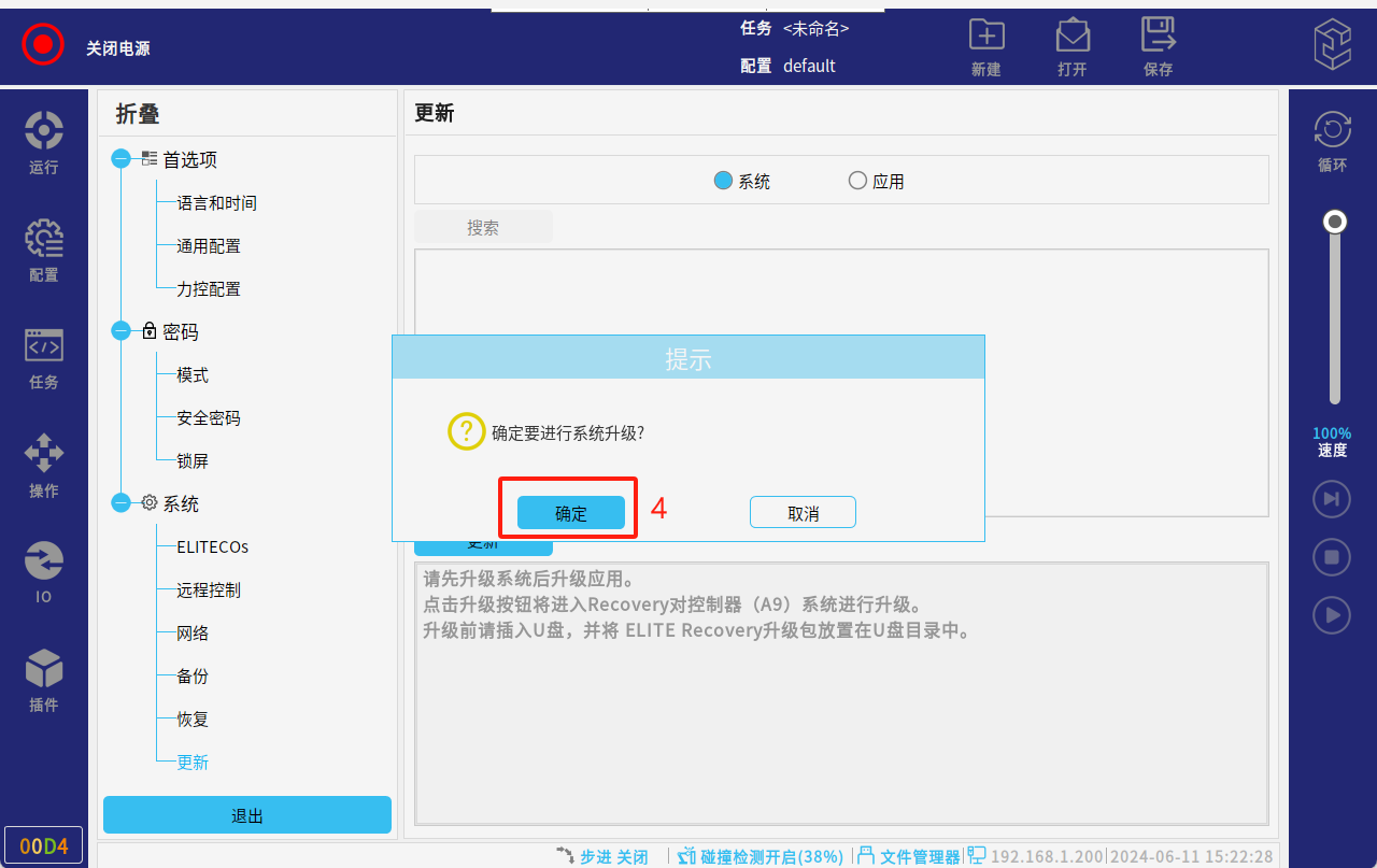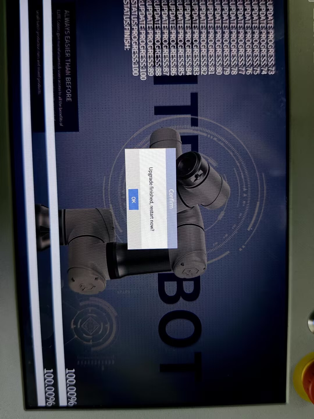 調(diào)試階段建議全部勾選進(jìn)行升級(jí),也可單獨(dú)勾選應(yīng)用升級(jí)(應(yīng)用:系統(tǒng)版本,一般是解決應(yīng)用軟件的bug和界面優(yōu)化;MCU: 指伺服升級(jí);驅(qū)動(dòng)IO:指末端IO的升級(jí))。點(diǎn)擊“是”,會(huì)自動(dòng)進(jìn)行更新系統(tǒng);請(qǐng)勿操作機(jī)器人或?qū)⑵鋽嚯姟5却潞笾貑ⅰ?/p>