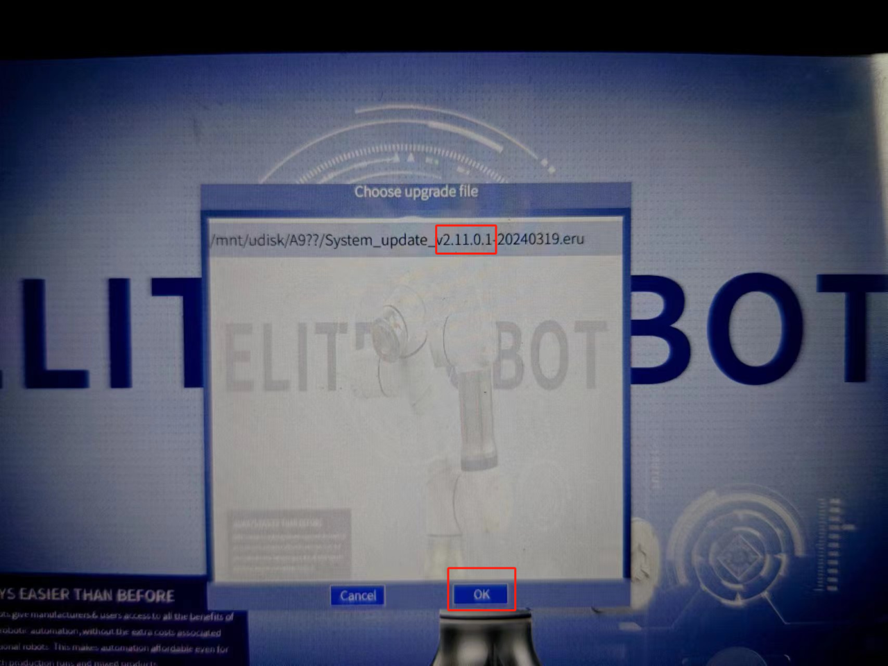 將下載完成的 ERU 格式文件放進(jìn) U 盤中,然后將 U 盤裝載至示教器上。