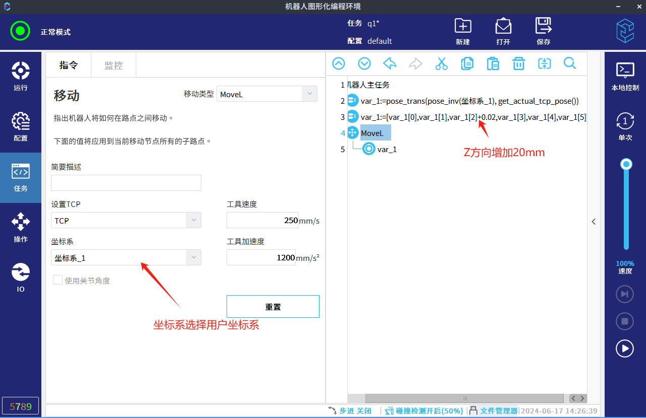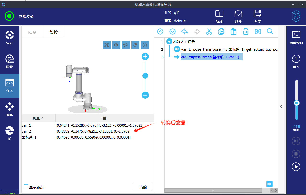 根據位姿變換指令,將user坐標系(坐標系_1)下的位姿(下方示例中var_1)轉換成base坐標系下的位姿(var_2)