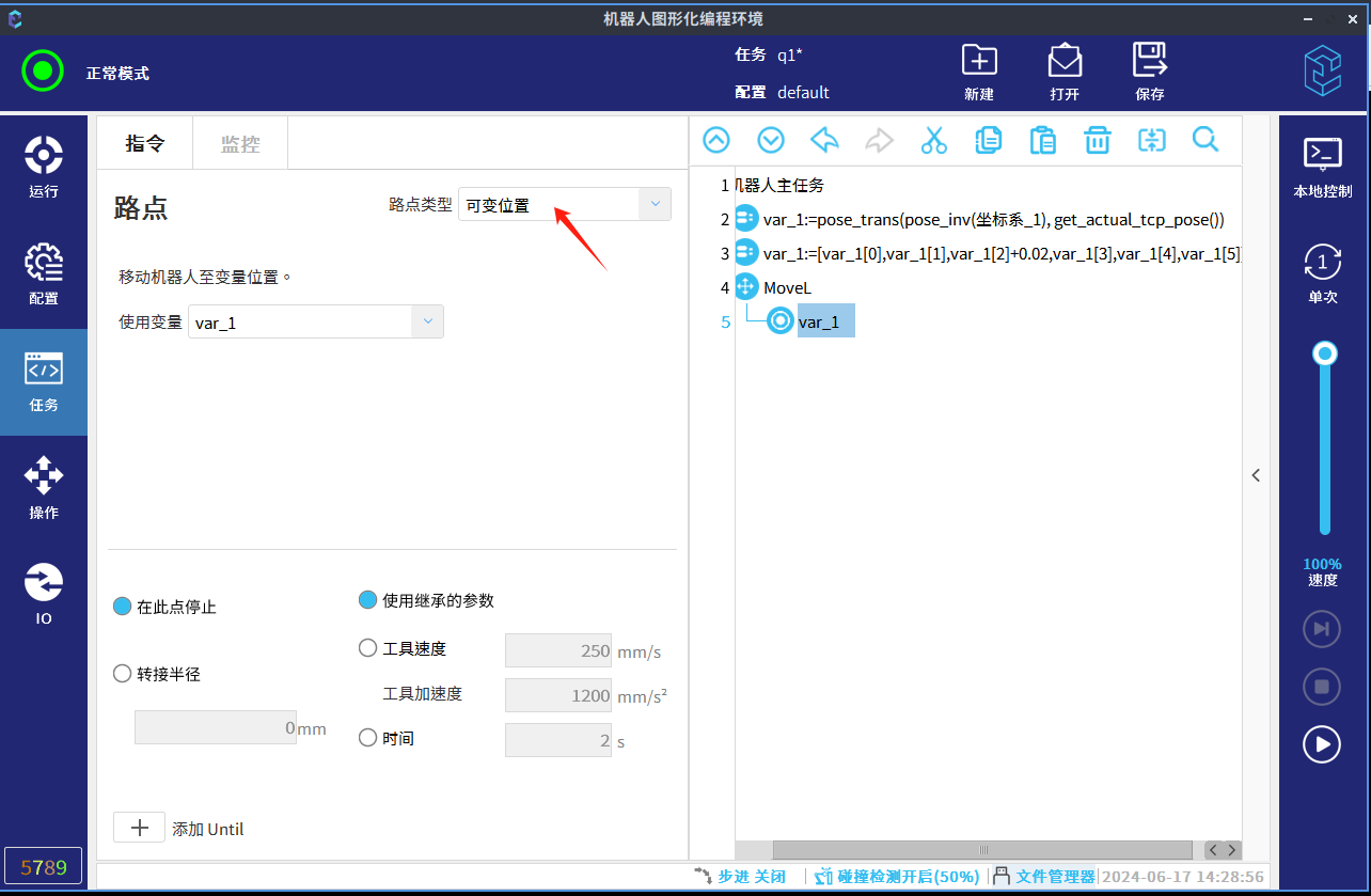 獲取到用戶坐標下位姿之后,可更改該數據,插入moveL指令(位姿數據用movel指令,關節數據用movej指令)路點類型選擇為可變路點。
