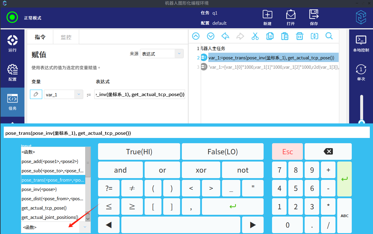 上述指令腳本內容可查看CS腳本手冊,具體參數手冊都有詳細解析,指令編輯框內有一些常用的指令函數,例如位姿變換獲取當前位姿等等可直接插入使用。
