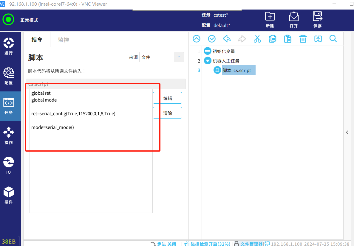ret=serial_config(True,115200,0,1,8,True)打開機器人控制柜 RS-485 通信功能
