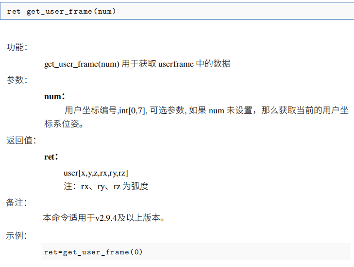 -- 將笛卡爾坐標 {X, Y, Z, RX, RY, RZ} 轉換到用戶坐標系 user1,結果存儲在 user1_v1 中